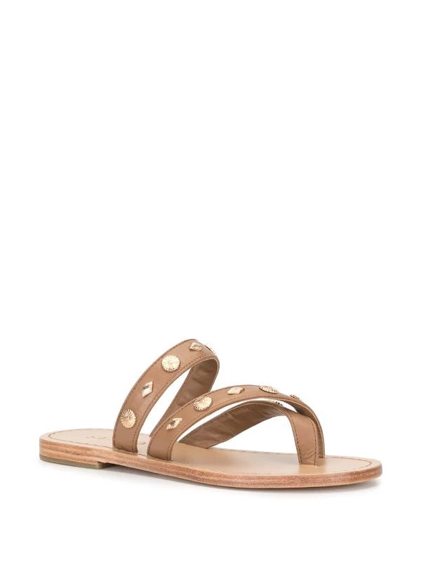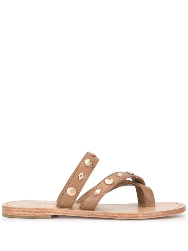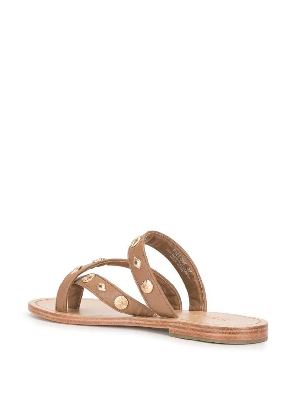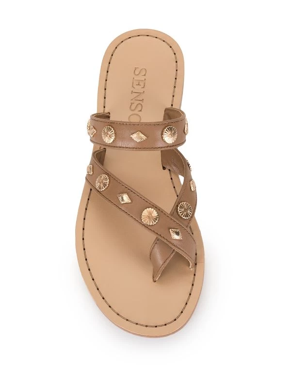 Tan leather Fallow studded sandals from Senso featuring a gold-tone stud detailing, an open toe, a branded insole and a flat heel.