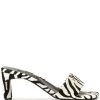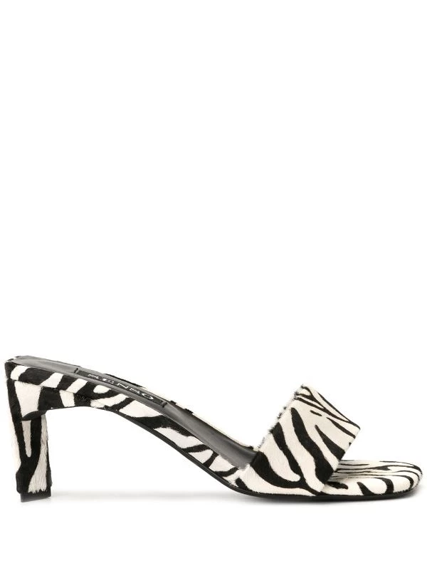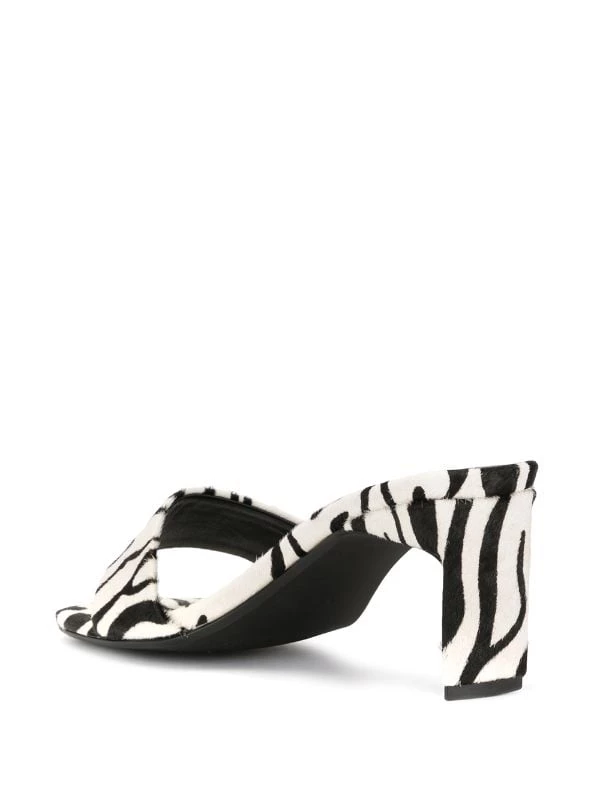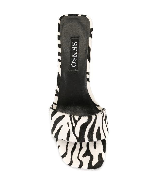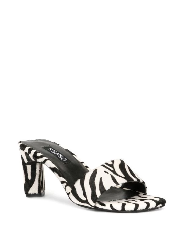 Safari white pony fur Maisy III mules from Senso featuring an open toe, a toe strap, an animal pattern, a fur trim and a tapered mid heel.
