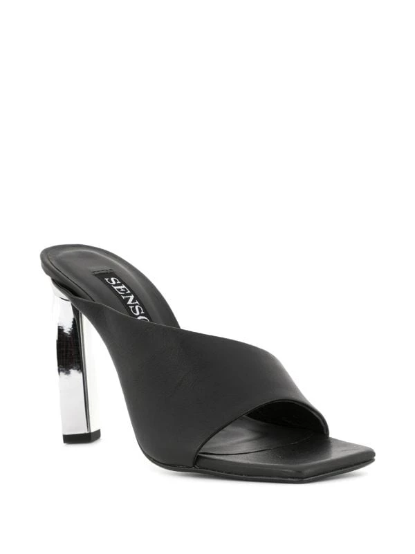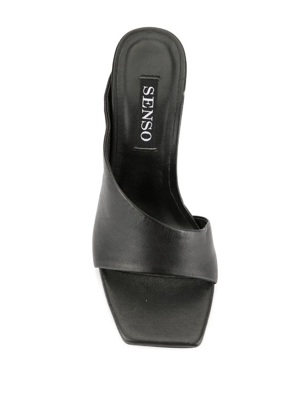 Ebony black leather Wilhemina I mules from Senso featuring an open toe, a toe strap, a slip-on style and a high block heel.